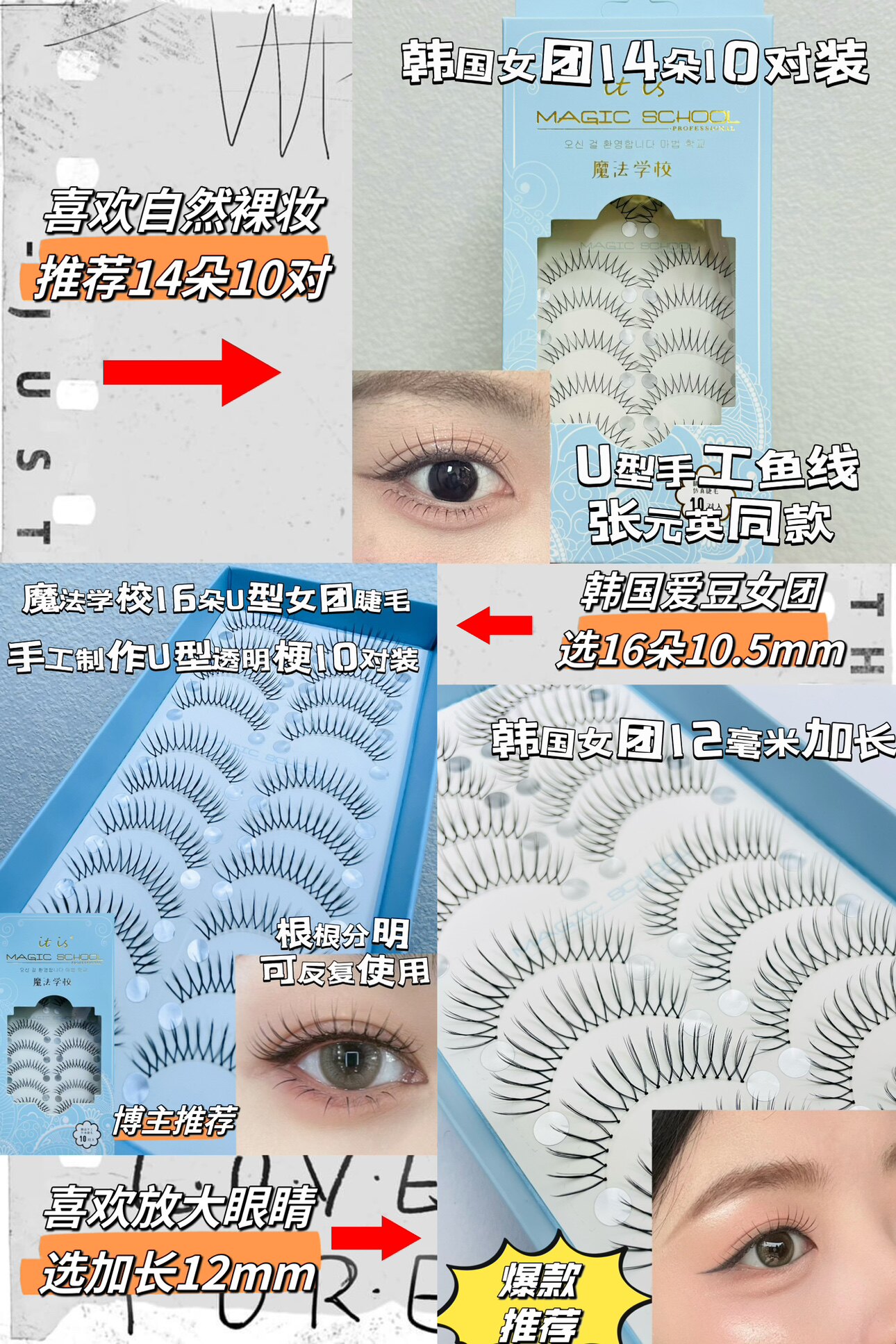 False eyelash style 16-flower girl group 10.5mm ten pairs M502,16 girl group 12mm ten pairs M503,14 women's group natural style ten pairs M501